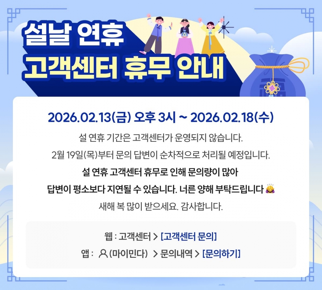설 연휴 2026.02.13(금) ~ 2026.02.18(수) 고객센터 휴무 안내