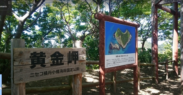 황금미사키 :긴 산책로를 걸어 전망하는 적단 블루의 웅대한 바다와 깎아 지른 절벽과 바위를 전망하고 위에서 보이는 하트 모양의 보물섬의 절경을 감상 할 수 있습니다.