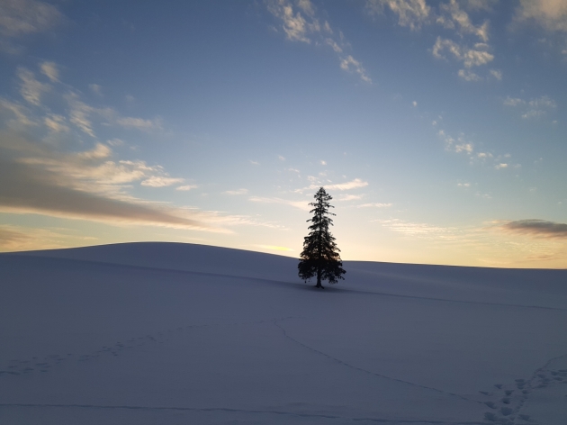 - 눈 쌓인 넓은 언덕에 어여쁜 크리스마스트리가 한 그루 자리하고 있습니다.