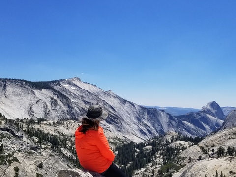 멀리 하프돔의 뒤쪽을 바라 볼수 있는 곳으로 바위언덕 아래로 펼쳐진 경치는 웅장 하면서 마치 외계 행성에 있는 듯한 분위기와 빙하가 만든 빙퇴석을 곳곳에서 볼수 있습니다.