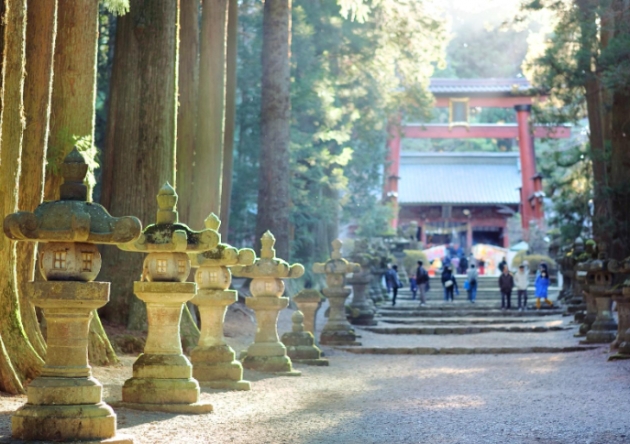 좌우로 노삼나무가 다가오는 참배길에 늘어선 이끼 낀 석등, 높이 18m의 오토리이, 고색창연한 신락전, 중후한 본전(중요문화재) 등 경내에는 장엄한 분위기가 감돕니다.