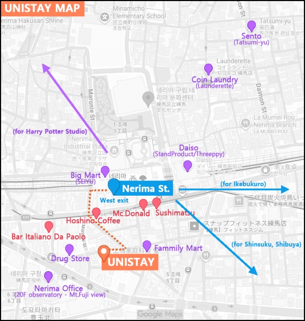 유니스테이 네리마점은 네리마역에서 도보3분 거리로, 네리마역은 신주쿠와 시부야역까지 전철 20분대로 도심 접근성이 아주 좋습니다.