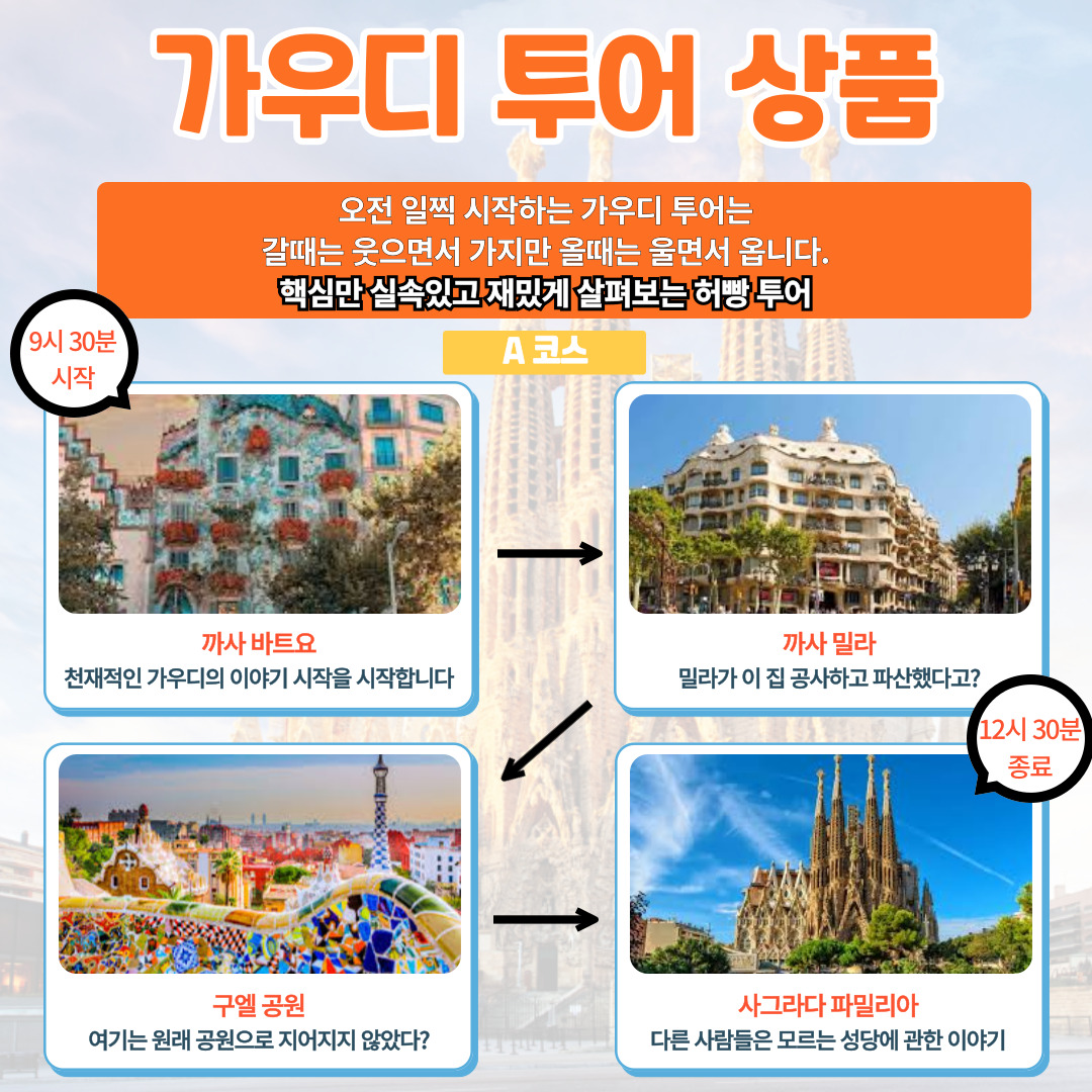 - 제 투어는 지루한 설명만 늘어놓는게 아닌 가우디에 대한 이야기를 농담을 섞어가며 풀어드립니다.